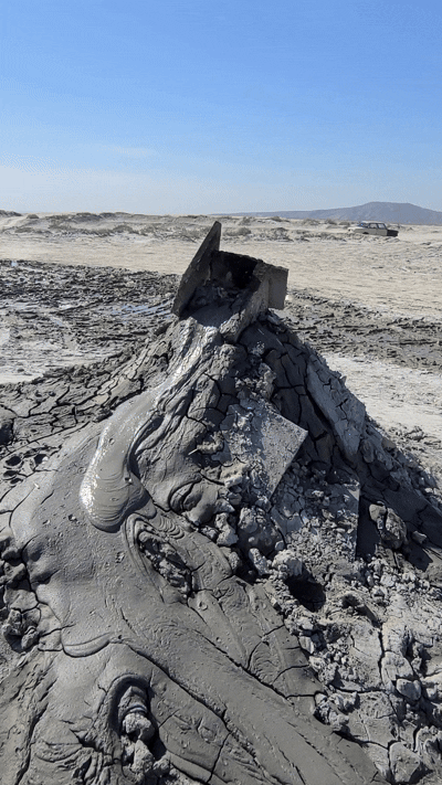 10 km di rally estremo con una Panda truccata: 70–90 all’ora tra dossi e cunette da 30 cm, in mezzo al nulla, dritti verso i vulcani di fango. Il posto è surreale: coni di terra che ribollono a bassa temperatura, pieni di gas, come pentole a pressione della natura.